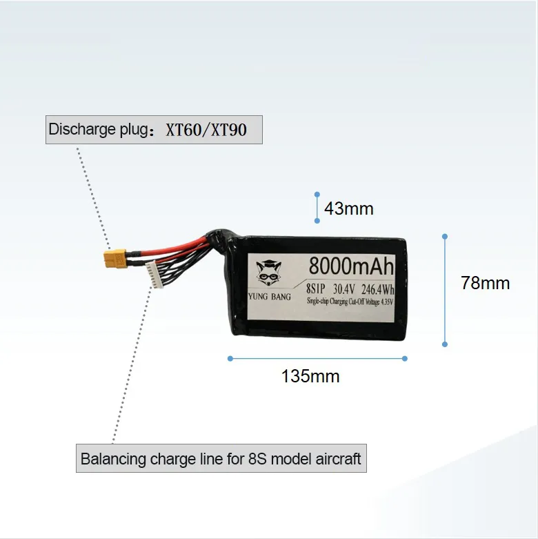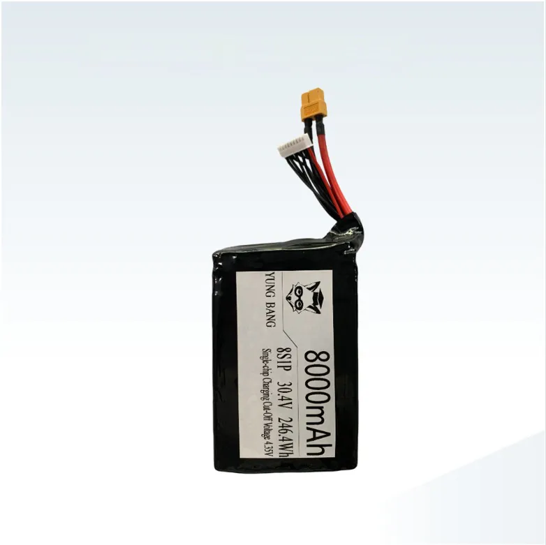 XYH Aerial Photography Drone Battery is an 8S1P 8000mAh lithium battery (30.4V, 246.4Wh) with XT60/XT90 discharge plugs and 8S balancing charge line. It powers carbon fiber drone bodies, 5 Inch FPV Drone Kits, and aerial photography drones, delivering long endurance for stable shoots—ideal for professional cinematography and industrial inspections.